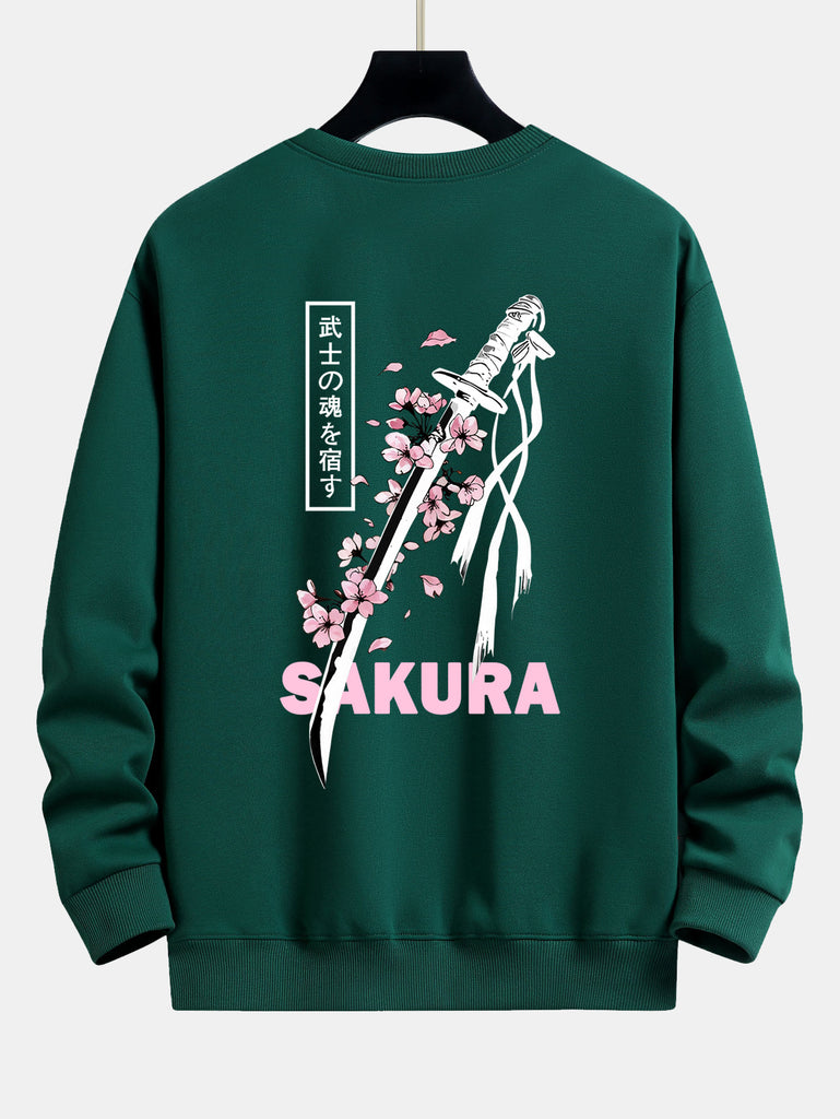Featuring a striking design of a katana surrounded by delicate sakura blossoms, this sweatshirt combines Japanese-inspired artistry with everyday comfort. Its relaxed fit makes it perfect for layering or wearing solo, ideal for casual outings, streetwear looks, or cozy days at home.