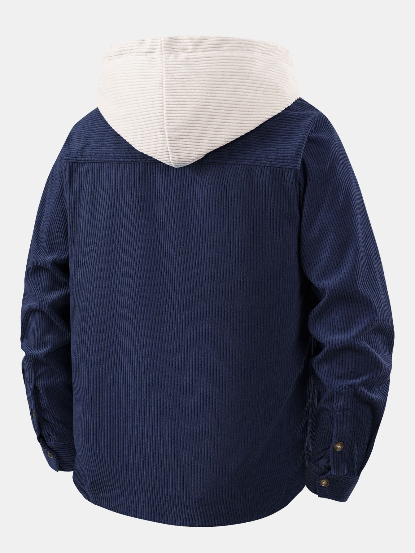 Denna avslappnade luvtröja är tillverkad av manchestertyg och har en mjuk, vintagekänsla. Luva och bröstfickor är panelerade med off-white manchester, vilket skapar en slående kontrast mot huvudmaterialet och tillför en känsla av lager och design. Perfekt för vardagsbruk eller semestrar på våren och hösten, den kombinerar komfort och stil.